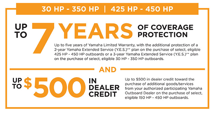 Consumer benefit for purchasing a new (unused, not previously warranty registered) select eligible Yamaha four stroke outboard is based on horsepower as follows: 425 -450 hp is a 24-month Yamaha Extended Service (“Y.E.S.”) contract (choice offered by Florida dealers is a 24-month Yamaha Extended Limited Warranty in lieu of Y.E.S. contract); 30-350 hp is a 36-month Yamaha Extended Service contract (choice offered by Florida dealers is a 36-month Yamaha Extended Limited Warranty in lieu of Y.E.S. contract); and 2.5-25 hp and 150-450 hp is a dealer credit of up to $700, based on hp, toward the MSRP value of goods and/or services purchased, at the authorized participating dealer that sold the outboard, at no extra cost to consumer. To be eligible, outboards must also have been manufactured since January 2018. Promotion is limited to available stock in dealer inventory that is sold, delivered, PDI (Pre-Delivery Inspection) completed, and warranty registered on YMBS by an authorized Yamaha outboard dealer between the dates of October 6, 2025 – December 8, 2025. Any outboard sold, delivered, PDI (Pre-Delivery Inspection) completed and/or warranty registered after these dates is not eligible. No model substitutions, benefit substitutions, extensions or rain checks will be allowed. Outboards sold or provided for commercial, camp, resort, guide, rental, promotional/demo, government agency, competition, tournament or sponsorship use are not eligible. This promotion cannot be used in conjunction with any other Yamaha offer. Some exceptions may apply. Some exclusions may apply in the Yamaha Extended Limited Warranty offered by Florida dealers (as compared to the Y.E.S. contract), such as TRIP coverage. In Florida, Yamaha Extended Service is administered by Automotive Warranty Services of Florida, Inc. 175 W. Jackson Blvd., Chicago, IL 60604 (866) 937-3983 (License #60023). Promotion is only applicable from authorized participating Yamaha Outboard dealers in the U.S.A. sold to purchasing consumers residing in the U.S.A. See authorized participating Yamaha dealer for complete details. Yamaha reserves the right to change or cancel this promotion at any time.